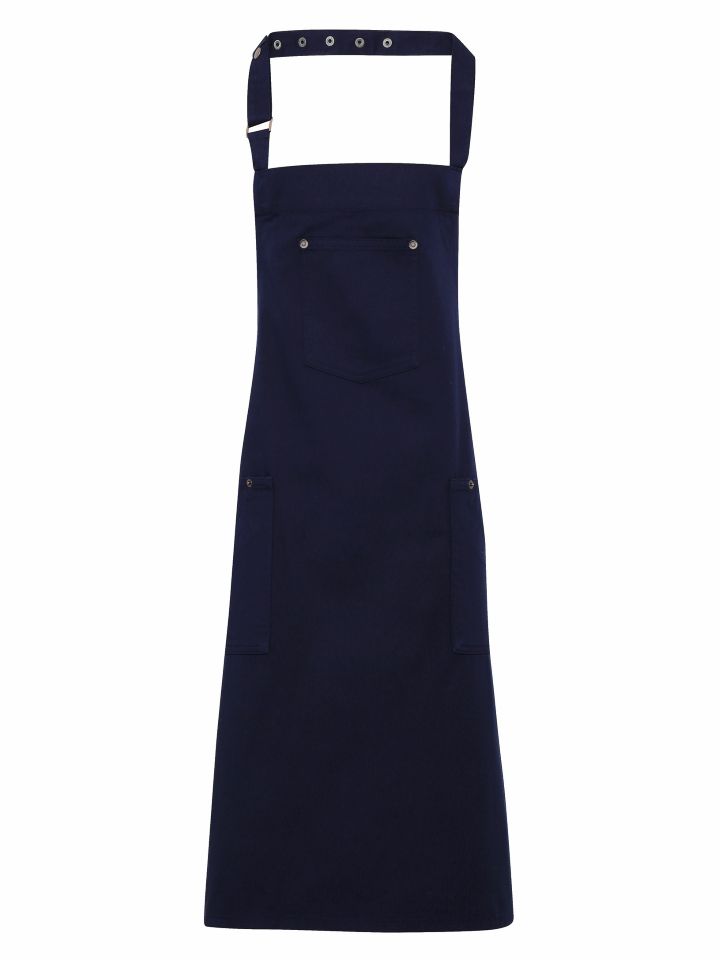 This full bib Apron is designed with classic ‘Chino’ style accents for a cool and edgy uniform solution for bars and restaurants. There are three functional pockets for design and practicality, together with a simple pop-snap button fastener to secure the neckband in place.